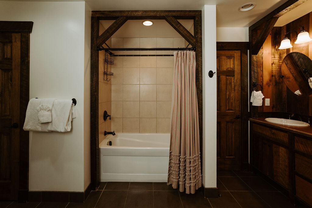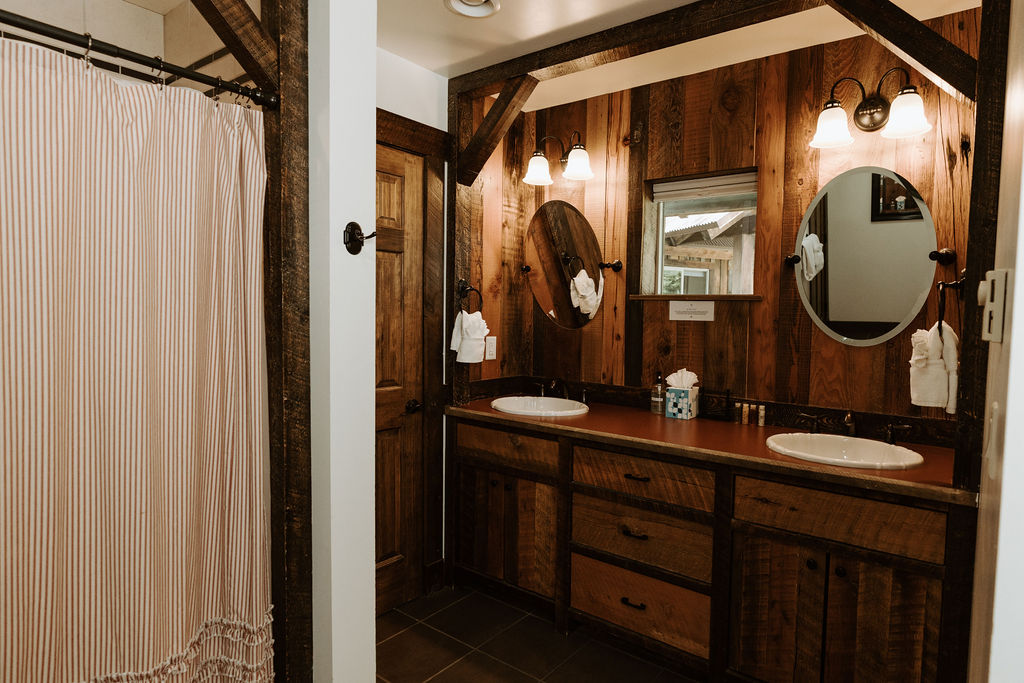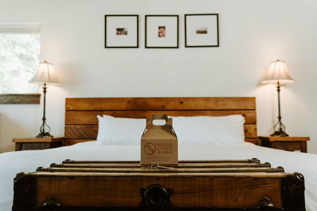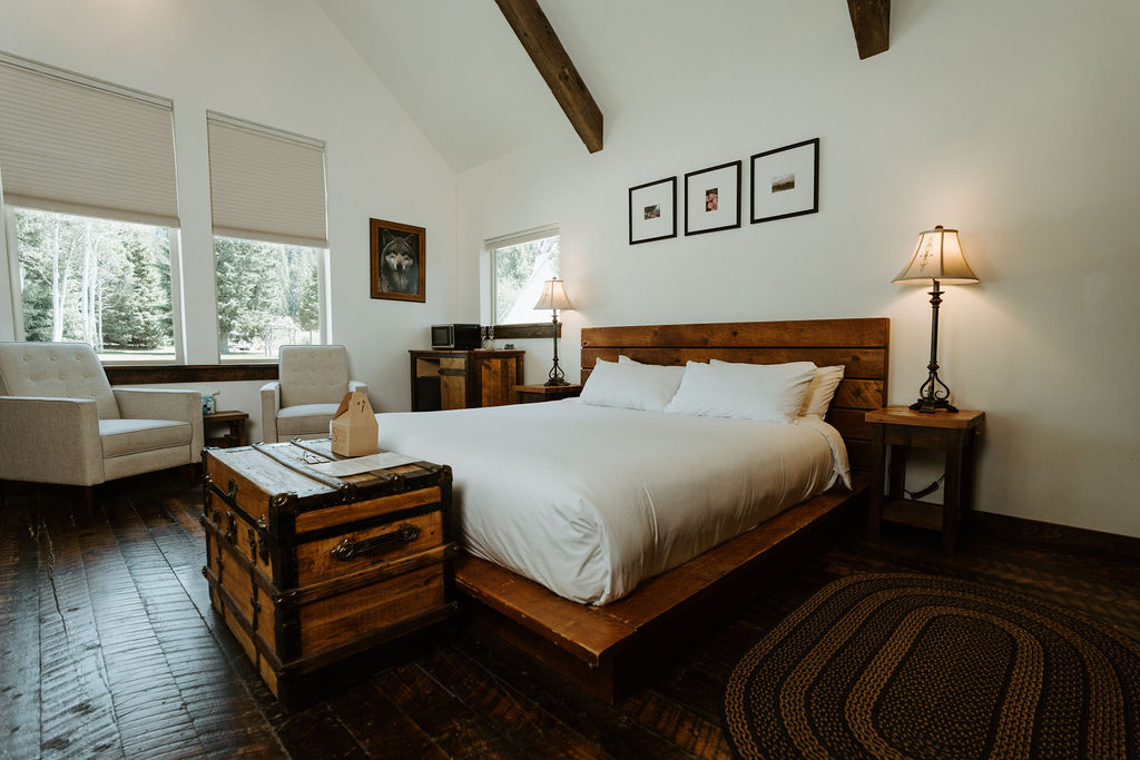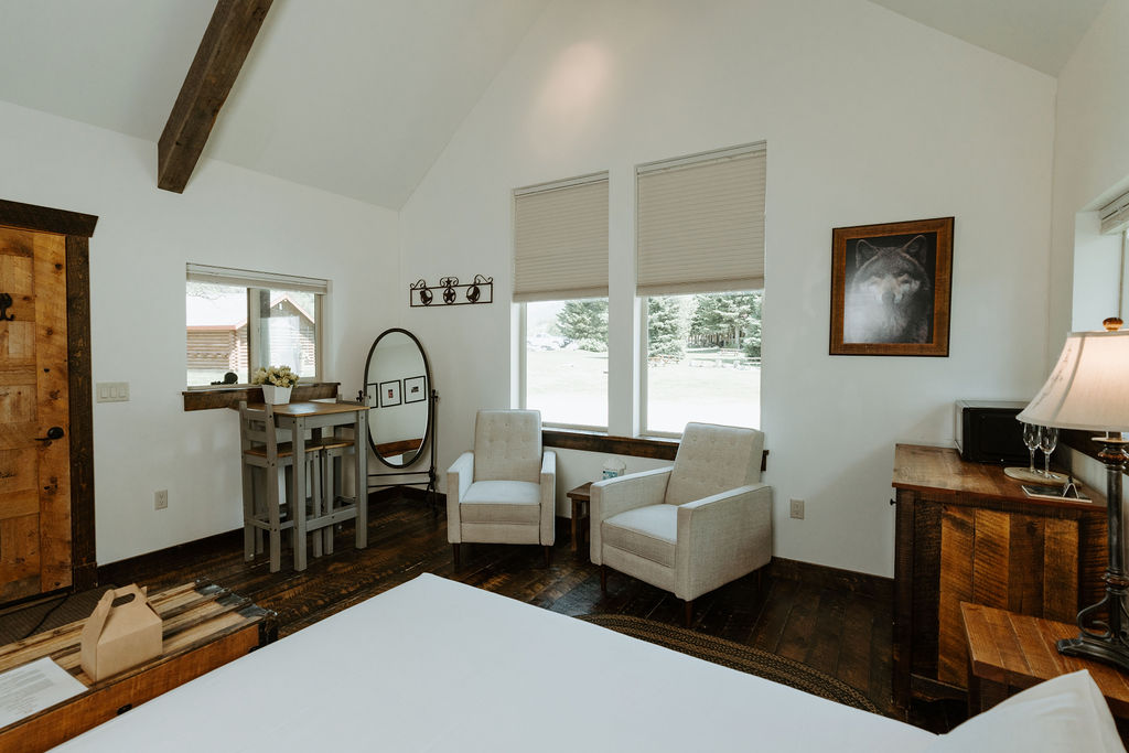 We have two Rendezvous Cabins on the ranch. Rendezvous Cabin One has 1 king bed and sleeps two people maximum. Many guests consider this to be our “honeymoon suite.” Rendezvous Cabin Two has 2 queen beds and sleeps four people maximum. These cabins are the most popular units that we have and often book out far in advance. Nestled among the aspen trees near the barn, these cabins offer amazing views of Moose Creek Canyon and offer welcome amenities like a sitting porch and gas fireplace. Cabin One also includes a soaking tub and Cabin One is ADA-compliant with a wheelchair ramp.