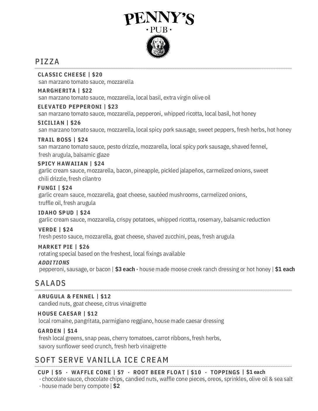 At Penny’s Pub, we serve food that reflects the land and the experience of being here. We focus on simple, high-quality ingredients, thoughtful preparation, and a relaxed atmosphere. Nestled along the creek, surrounded by trees, open space, and mountain views, our menu is built around three pillars: handmade wood-fired pizza, fresh salads, and soft serve ice cream.